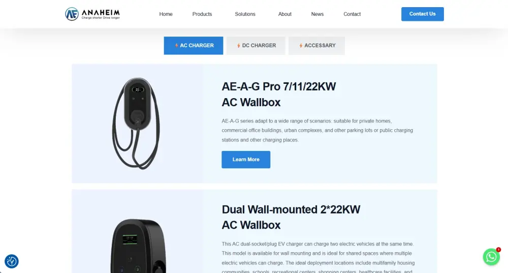 产品中心页将产品按机型分为三大类,分别是 AE-A-G Pro 7/11/22kW AC Wallbox、Dual Wall-mounted 222kW AC Wallbox、Dual Floor-mounted 222kW AC Charger。每个产品以列表式图文卡片展示,包含产品图、功率、核心应用场景等关键信息,用户点击 “Learn More” 即可跳转至详细产品页,快速获取更多产品参数与细节。